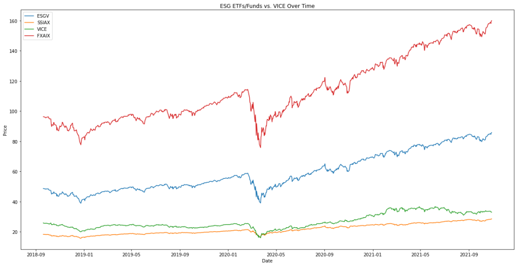 The VICE is an ETF comprised only of sin stocks. The ESGV is an ESG-based ETF, while the SSIAX is an ESG fund. The FXAIX is a fund which seeks to mimic the S&P 500 index.