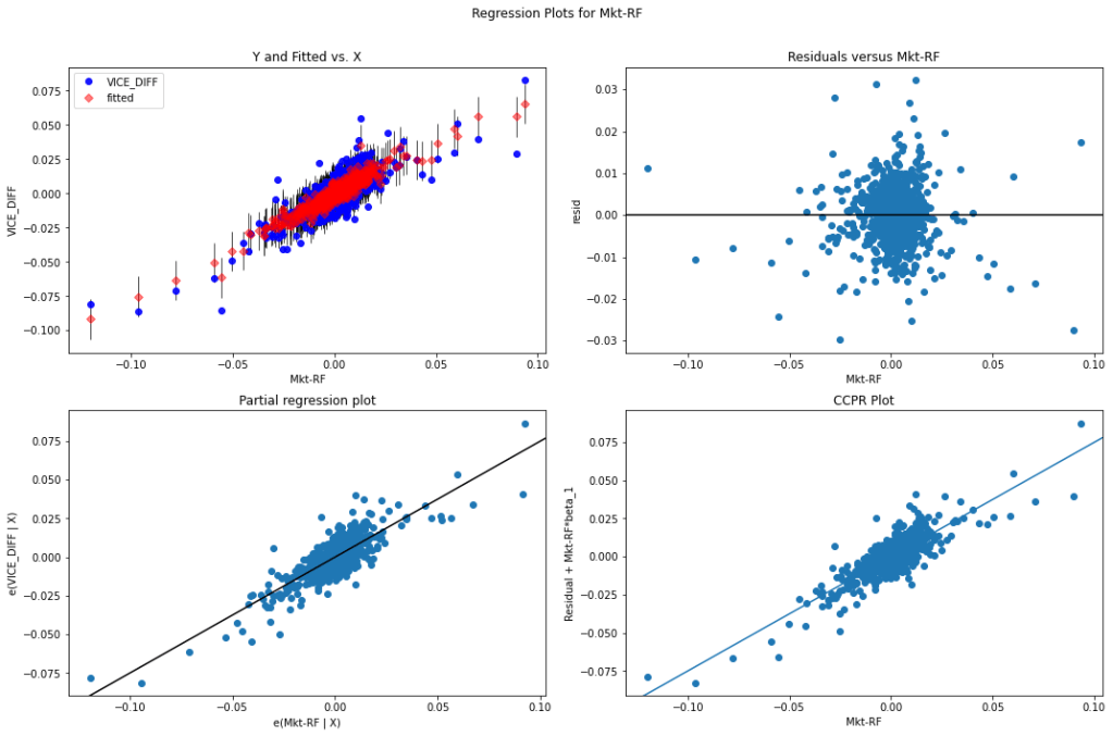 What we’re trying to establish here is whether the fund/ETF – such as the VICE or ESG-based (SRI) funds – outperform or underperform the market, given a set of factors (HML, SMB). This performance is captured by alpha (), and should be statistically insignificant if the model fully explains the ETF’s returns.